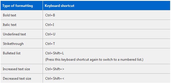 You can format text, add bullets to make a list, or change the text size by using keyboard shortcuts. Here's how: